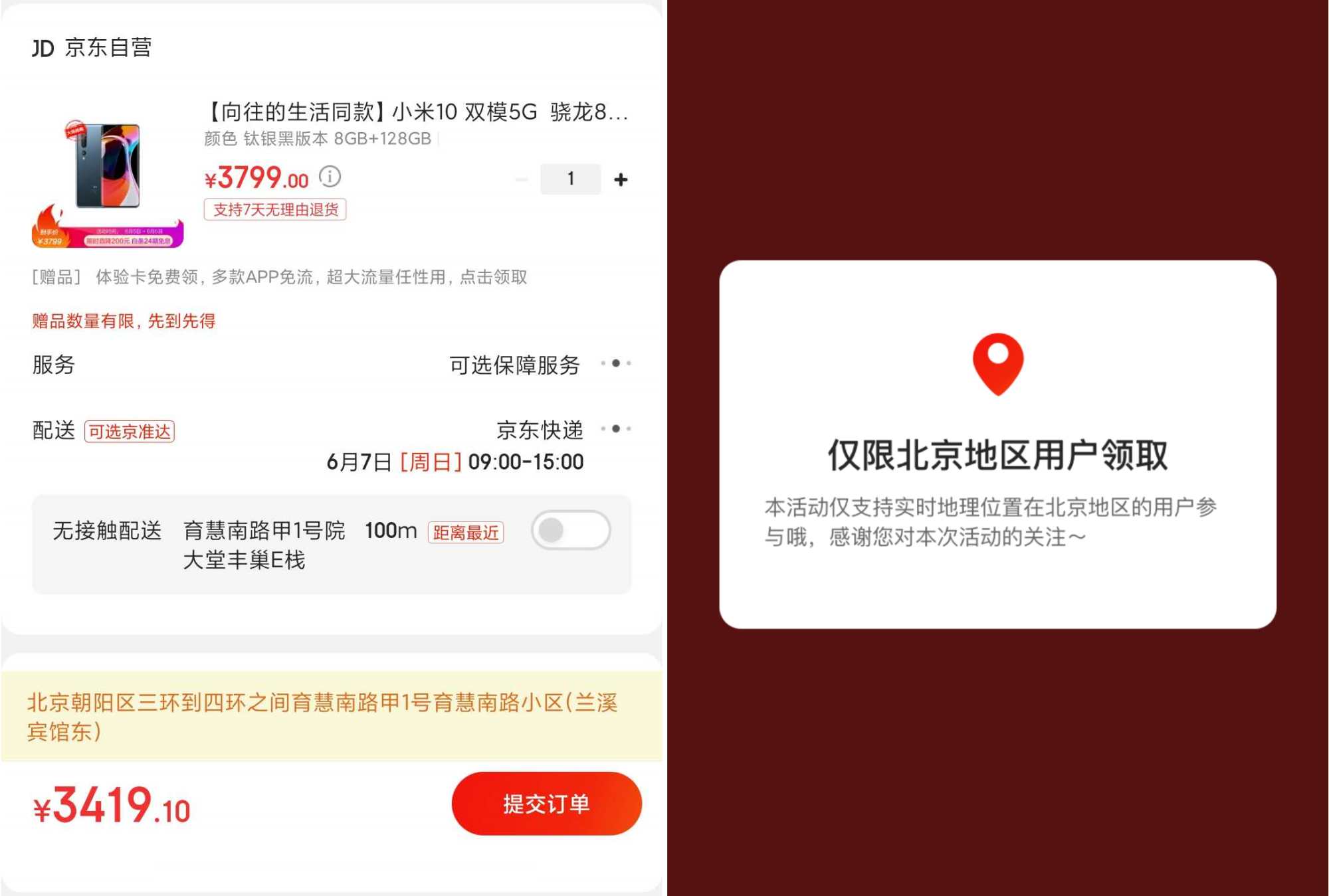 北京消费季优惠到什么程度呢,有网友发现在某东入手一台小米10 8GB+128GB版本仅需3419.1元,也就是在现有价格的基础上再打9折,只不过该活动仅限北京地区的用户可以领取,而且收货地址也必须是在北京市内。