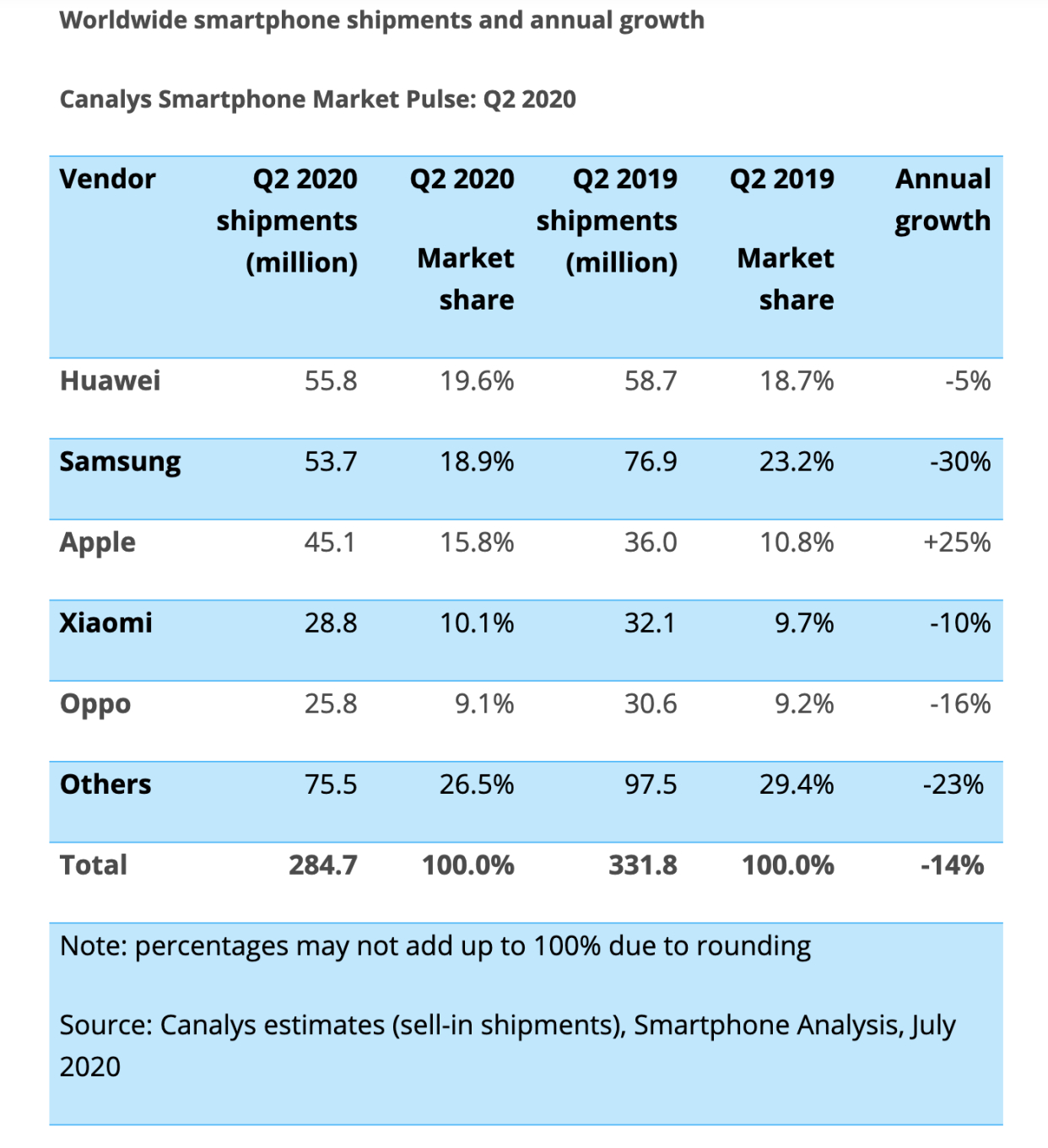 来自Canalys和IDC的数据均显示华为智能手机出货量为5580万台,同比去年有5%的下滑,但由于三星交出了一份暴跌的成绩,Canalys显示三星跌幅为30%,IDC显示三星跌幅为28.9%,最终三星交出了5400万左右的成绩,将龙头位置拱手让给了华为。