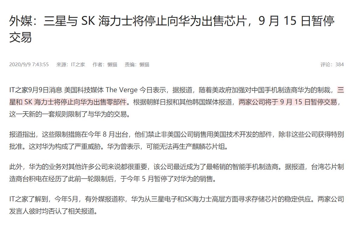 最新的一份报道显示,由于美国对华为的制裁升级,三星和SK海力士将停止向华为出售零部件,这两家公司将于9月15日暂停与华为交易,如此一来将意味着华为面临没有闪存存储可用的局面,不仅手机做不了,其他电子设备相关业务很大程度上都会受到影响。