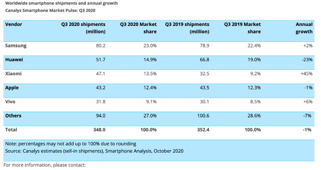 作为对比,目前排名第一的三星在第三季度的出货量提升到了8002万台,对比去年有约2%的提升。三星出货量的提升,一定程度上是因为华为销量暴跌所带来的,不过真正吃下华为市场的并非三星,而是小米,因为第三季度小米手机出货量大涨了45%。