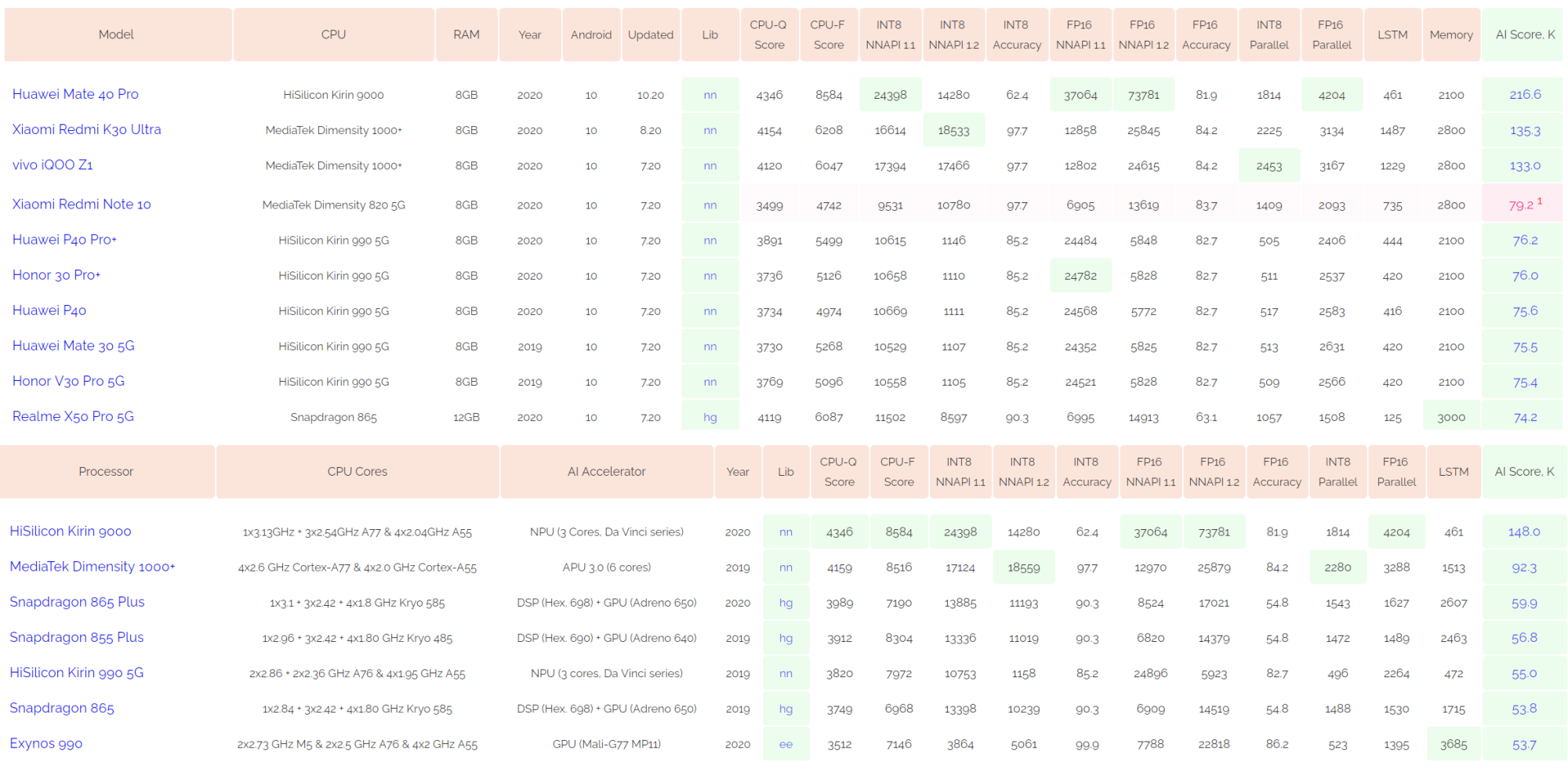 在苏黎世理工大学的AI Benchmark跑分中,麒麟9000的总分成绩为148分,夺下了第一名,领先第二名的联发科天玑1000+多达60%,同时还在CPU-Q、CPU-F、INT8整数运算(NNAPI 1.1)、FP16(NNAPI 1.1/1.2)中均保持绝对领先。