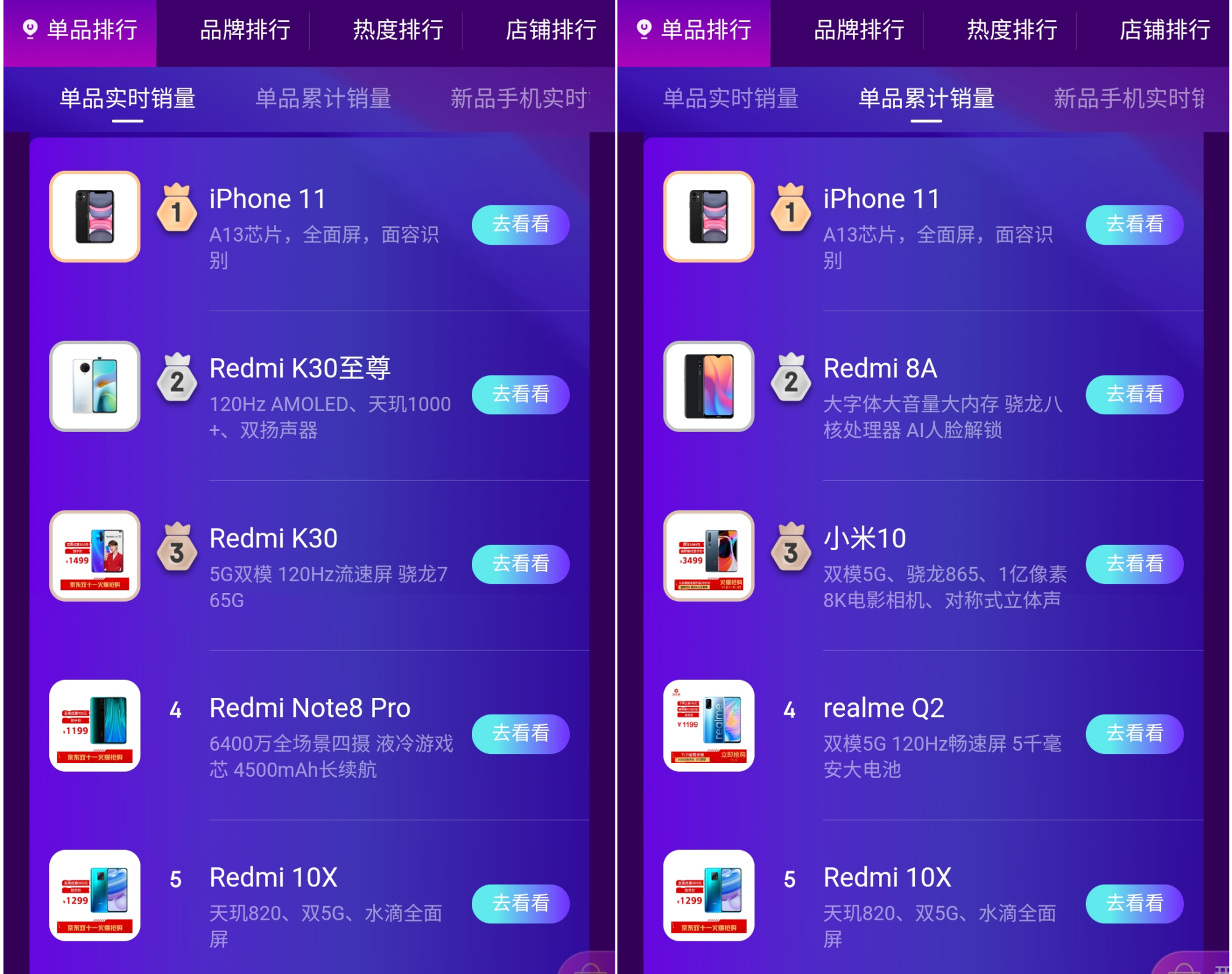 拿某东当前的实榜单来和总榜单来说,iPhone 11都稳居榜首,成为了今年双11开场最畅销机型,一直被唱衰的苹果,再次在今年的大促中证明了自己。相比之下被国人追捧的华为,却在本次大促中表现平平,前十名中仅有一款荣耀Play4排在第九名。