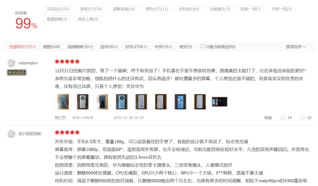 在京东商详页获悉,这款手机目前的累计评论数已经突破一万条了,好评率更是达到了99%,意味着华为Mate 40得到了大家的认可。