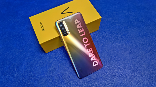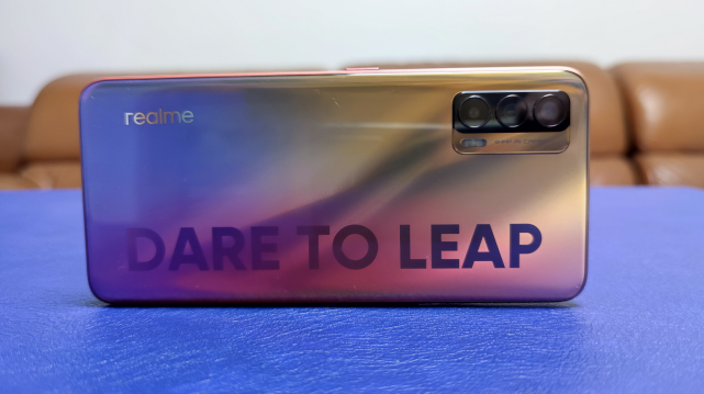 手机背面的相机模组沿袭realme家族一贯的「麻将排布」,右边是英文品牌LOGO,烫印着「DARE TO LEAP」敢越级,也是延续了realme 真我V5的设计元素。