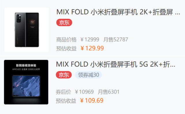 需要注意的是,京东上有两条小米MIX FOLD的SKU,第一条商品已经下架,第二条是最近才上线的,月销量也达到了6301台,可见成绩真的相当不错。