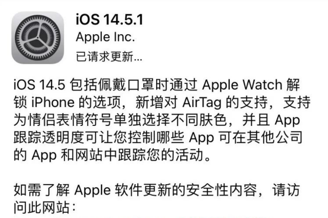 不过该系统在推送一周后,很快又进行了小版本更新,iOS 14.5.1迅速降临,主要是修复APP跟踪透明度重新启用后没有提示的BUG、还有与WebKit有关的问题安全问题。