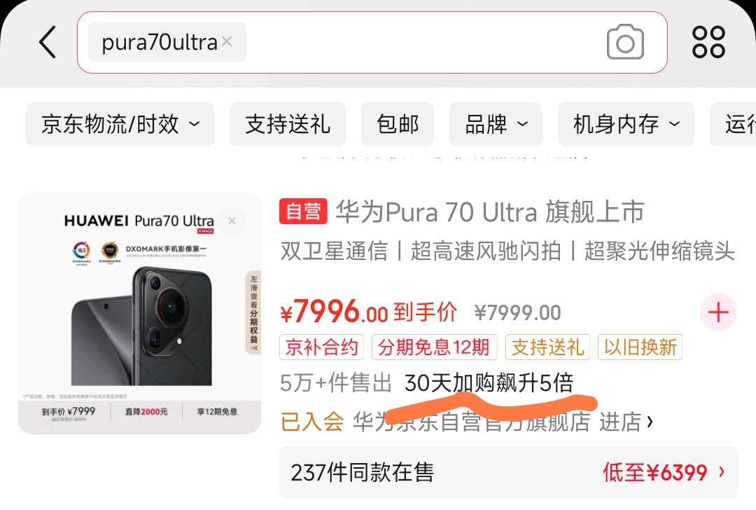 查询某东页商品发现,华为Pura 70 Ultra在过去一个月里的加购量居然飙升了5倍,这充分说明意向用户非常之多,很多消费者都在考虑入手。