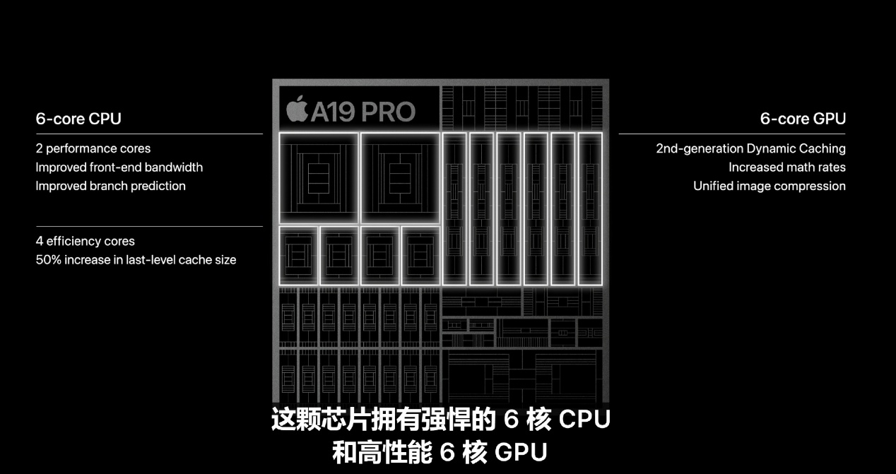 iPhone 17 Pro搭载满血版A19 Pro采用6核CPU、6核GPU架构,神经网络加速器的峰值算力是A18 Pro的4倍,高性能稳定性相比前代提升40%。