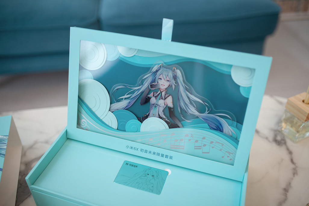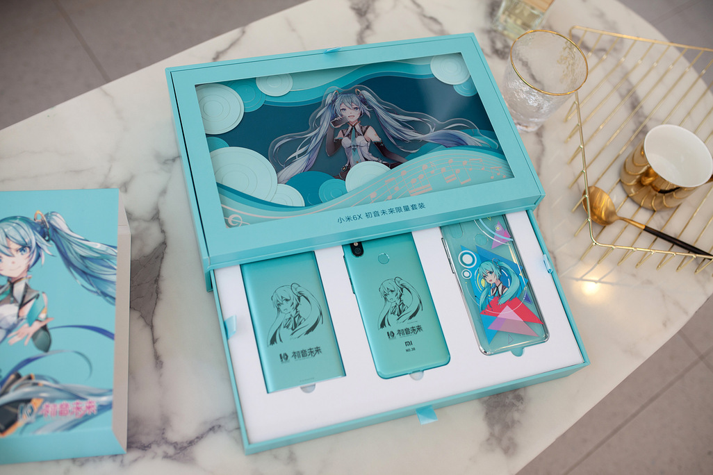 打开手机包装盒,我们可以看到里面有一台全球唯一编号的小米6X,机身背面雕刻着全新的初音未来形象,附赠一个初音未来定制保护壳、一个10000mAh的定制版移动电源以及限量金属铭牌。