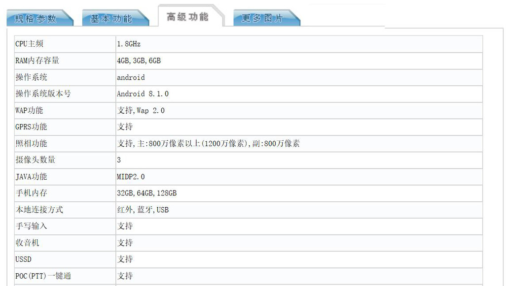 配置方面,根据入网信息显示,该机将搭载主频为1.8GHz的八核处理器,有3GB、4GB和6GB版本,存储方面有32GB/64GB/128GB三个版本,采用1200万像素后置双摄,搭配前置800万像素前置镜头,整体配置非常均衡。