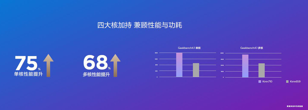 不过就在华为Nova3/3i新机发布会上,华为总算推出了全新的麒麟710处理器,这款处理器配备了四个A73、四个A53 CPU核心,采用的是Big.Little混合架构设计,最高频率可达到分别为2.2GHz、1.7GHz,这样的成绩相比上代,单核性能提升75%、多核性能提升68%。