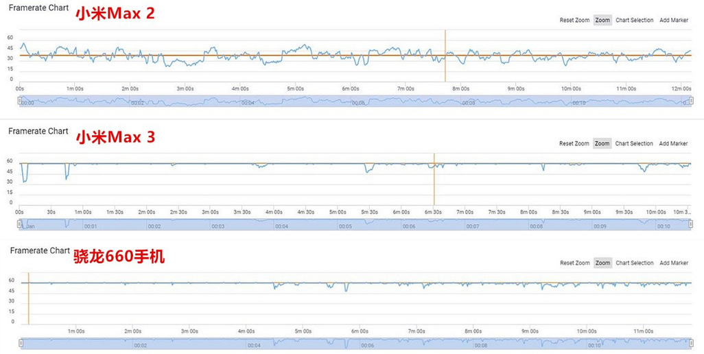 从上面的详细帧数曲线来看,搭载了骁龙625的前代小米Max 2帧数波动较大,平均帧数只有37.6,空旷场景可以到55帧,一旦出现复杂一些的画面就会感觉到明显的帧数降低,团战时甚至会降低到20帧以下,所以搭载骁龙625的机型游戏体验并不理想。作为对比项,搭载骁龙636的小米Max 3的帧数表现十分稳定,几乎可以全程跑满60帧,平均帧数59.2。而搭载骁龙660手机的平均帧数59.4,帧数波动较小。