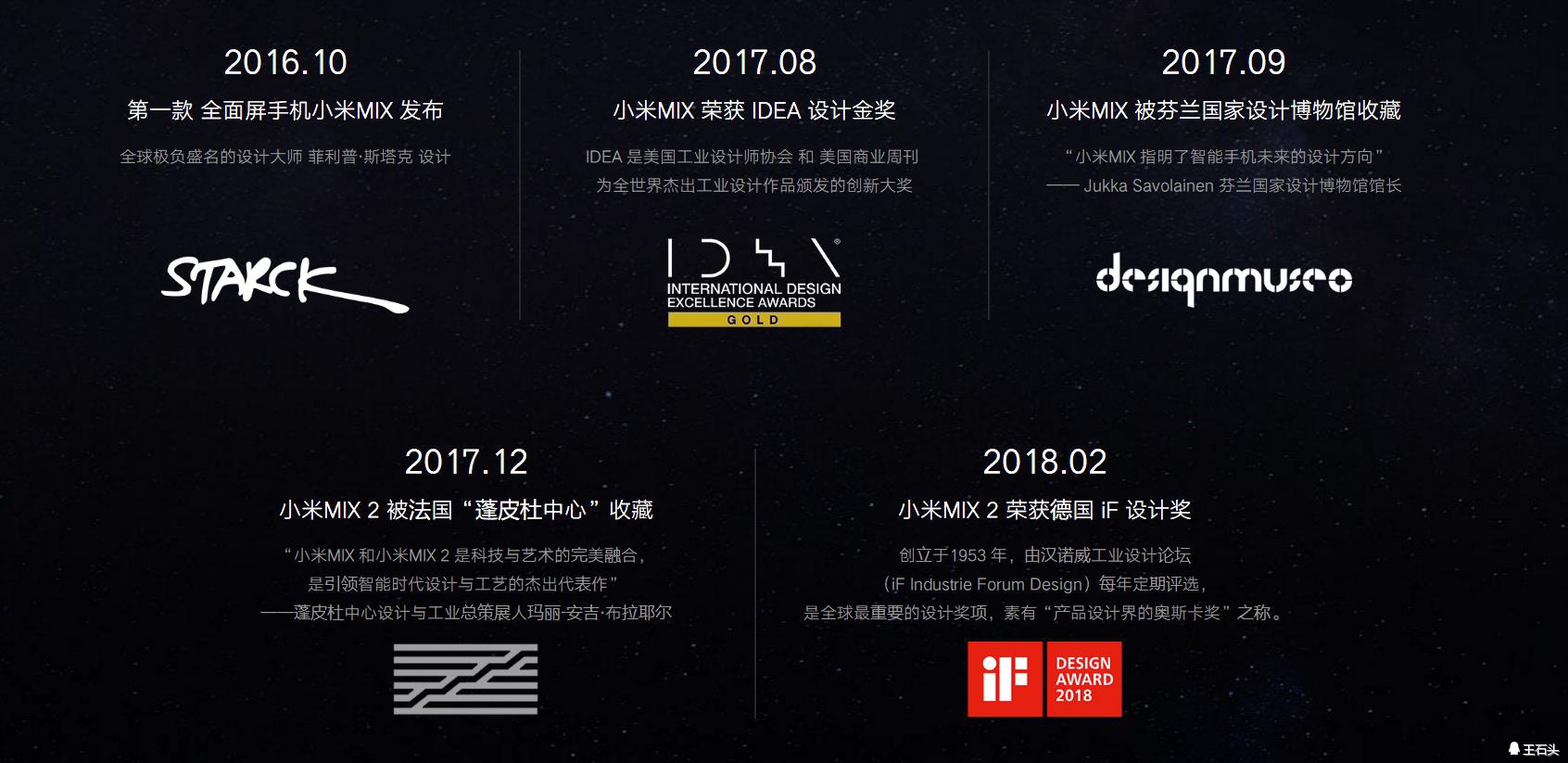 2017年9月小米MIX被芬兰国家设计博物馆收藏,这也是继IDEA设计金奖后,小米全面屏手机再一次得到了国际的认可,当时给出的评价是“指明了智能手机未来的设计方向”,如果这款手机被一家博物馆收藏存在偶然性,那下面再看看。