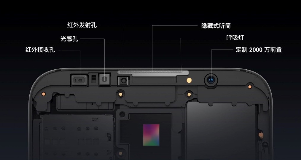 虽然上下边框极窄,但是设计团队并未因此割舍掉手机本该拥有的功能体验,比如在极窄的顶部额头中放入了听筒等多个元器件,包括红外发射孔、红外接收孔、感光孔、呼吸灯以及一颗定制的2000万前置镜头。