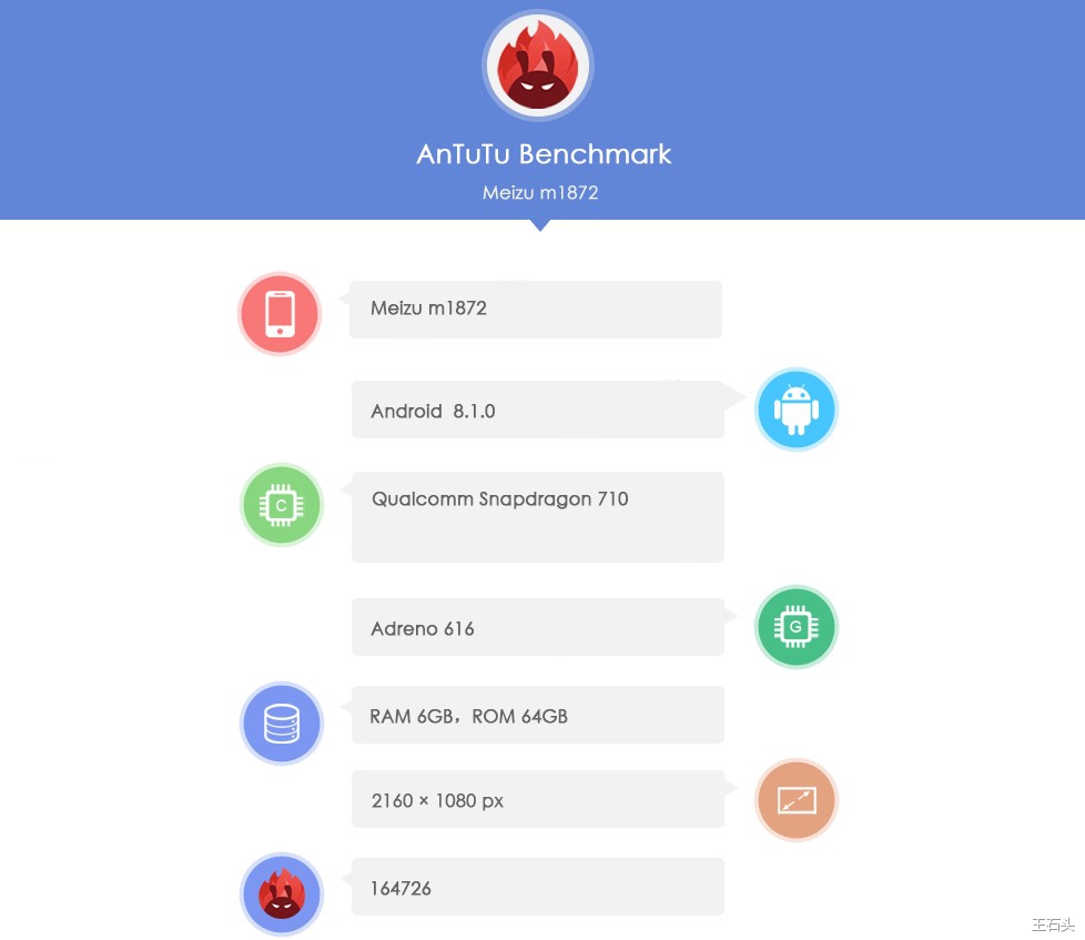 性能表现方面,这款魅族X8现在已经出现在安兔兔评测数据库中,代号为m1872。从安兔兔跑分数据来看,这款手机性能表现还算不错,达到了164726分。此外该机屏幕分辨率为2160 x 1080 像素分辨率,即18:9全面屏,配备了6GB RAM和64GB ROM,当然,还有4GB的版本,系统版本则是 Android 8.1.0。