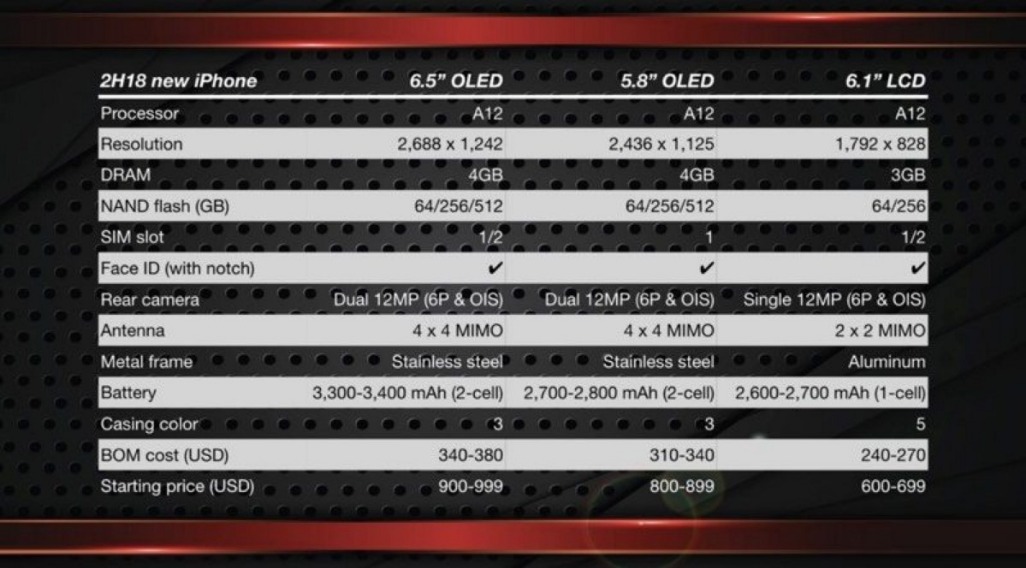 郭明錤还表示,廉价版的iPhone将拥有3GB内存,有64GB/256GB两种存储容量可选,机身采用了铝合金边框设计,所配的LCD显示屏分辨率为1792×828像素,同时还会提供五种色彩款式。OLED屏采用的是不锈钢边框设计,运存会升级至4GB版,还会增加/512GB的存储容量版。