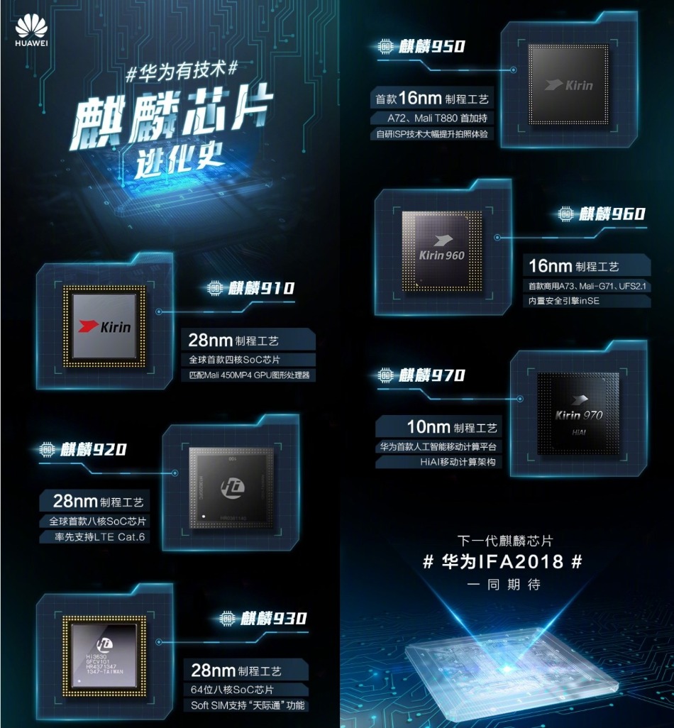 随着麒麟980即将发布,现在华为官方微博也通过一张图片回顾了麒麟芯片的发展简史,从最初的麒麟910(K3V2+)到现在的麒麟970,六代产品经历了从28nm到10nm的发展,不仅工艺得到了巨大提升,性能方面也得到了稳步提升,这也更让人期待即将发布的麒麟980。