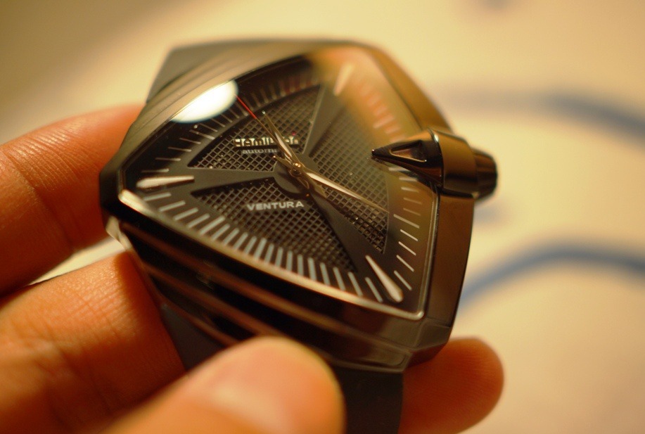 汉米尔顿探险未来腕表,该表的特色在于外观设计,因为它的表壳造型极为特殊,精钢材质的表壳棱角分明,此外还采用了四边形设计,它以表冠和9点钟位置所连接的中轴线为对称点排列。表冠更是犹如子弹头,个性十足。