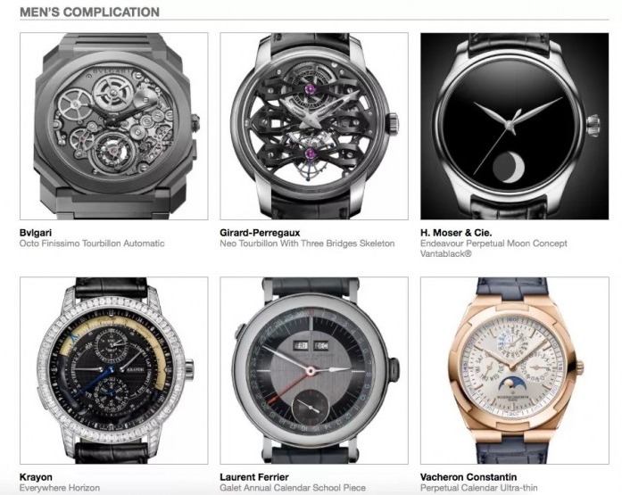 宝格丽:Octo Finissimo Tourbillon Automatic 、芝柏:Neo Tourbillon With Three Bridges Skeleton、亨利慕时:Endeavour Perpetual Moon Concept Vantablack® 、Krayon:Everywhere Horizon 、罗伦斐:Galet Annual Calendar School Piece 、江诗丹顿:Perpetual Calendar Ultra-thin。