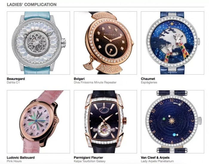 博勒加德:Dahlia C1、格丽:Diva Finissima Minute Repeater、尚美巴黎:Espiègleries、Ludovic Ballouard:Pink Hours、帕马强尼:Kalpa Tourbillon Galaxy、梵克雅宝:Lady Arpels Planétarium。