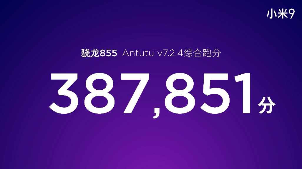 紧接着,雷军又公布了小米9的配置,骁龙旗舰处理器是小米旗舰机最基础的配置,所以毫不意外小米9搭载了一颗骁龙855最强处理器,根据官方曝光的信息显示,小米9安兔兔跑分达到了387851分。