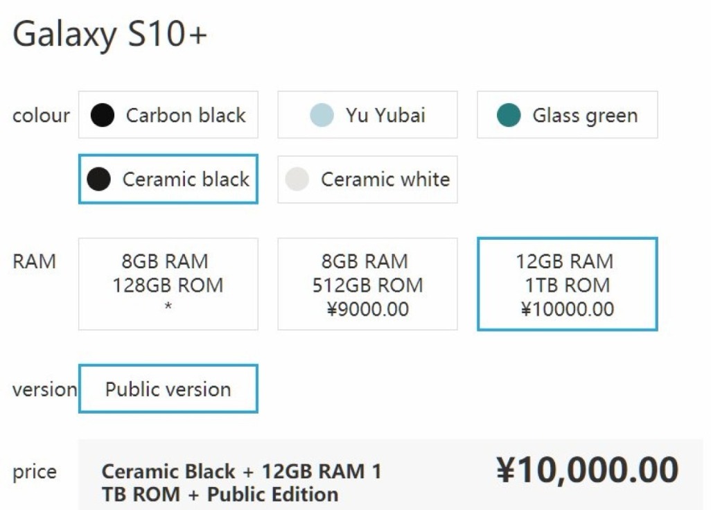 其它参数部分,根据泄露文件显示,三款机型均支持无线反向充电;S10+电池容量可能高达4100mAh,S10为3400 mAh,S10e为3100 mAh;起始配置为 6GB RAM + 128GB ROM,S10+最高可选 12GB RAM + 1TB ROM;S10+、S10 均有白、黑、绿三款配色,S10e还额外可选黄色配色。