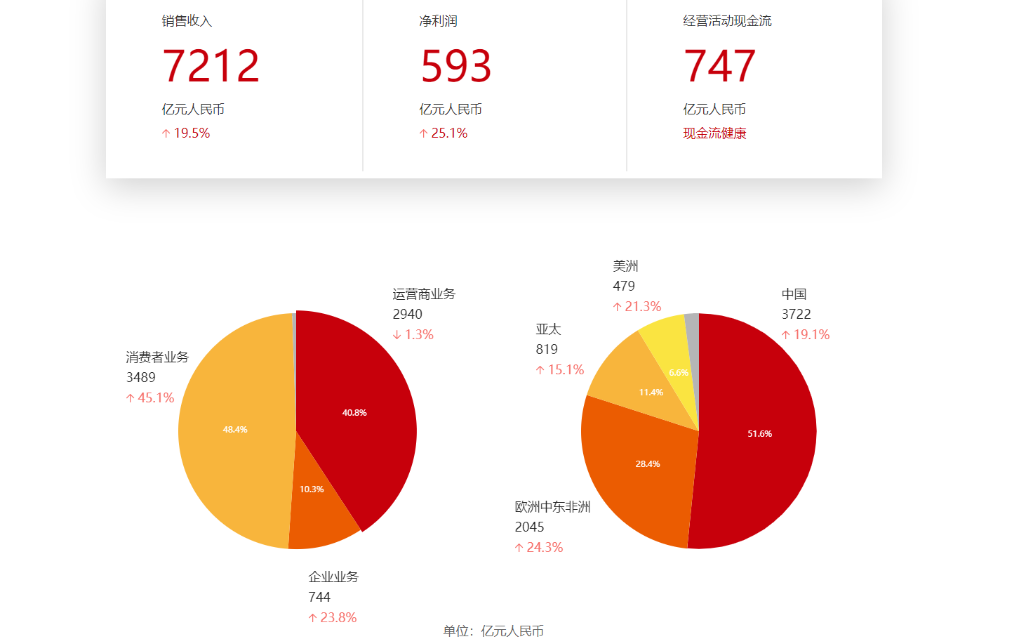 具体到年报营收部分,华为三大业务分别为运营商业务、企业业务和消费者业务,对应的销售收入为2940亿元、同比下滑1.3%,744亿元,同比增长23.8%;3489亿元,同比增长45.1%,消费者业务首次成为华为第一大营收支柱,占总营收48.4%。