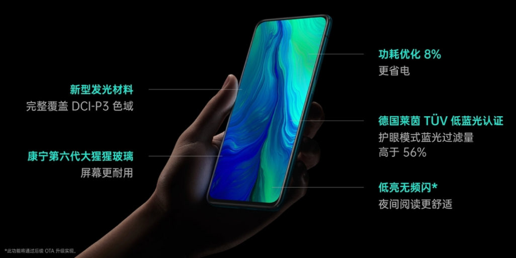 在外形上,Reno标准版配备了一块6.4英寸全景屏,变焦版采用6.6英寸全景屏,屏占比高达93.1%,屏幕材质均为康宁第六代大猩猩玻璃,完整覆盖 P3 色域,功耗降低 8%,并获得了德国莱茵 TÜV 的低蓝光护眼认证,屏幕蓝光过滤量高于 56%,同时还加入了DC调光功能。