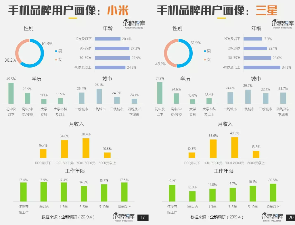 同样作为一线品牌的OPPO、vivo,两个品牌的用户画像非常接近,女性用户比例极高,达到了60%左右,用户群体主要分布在三四线城市,用户占比接近65%,同时OV用户的学历普遍偏低,初中及以下学历用户占比到达了66.3%和64.8%,用户月收入3000以下的也达到了60%左右。